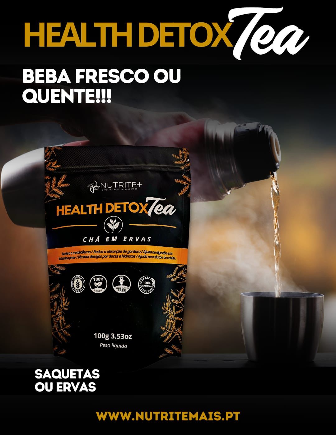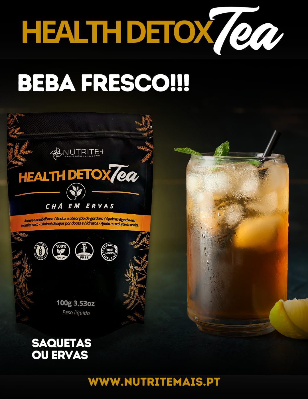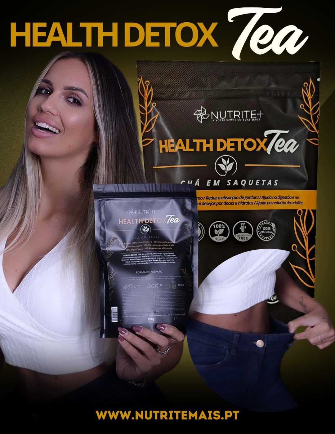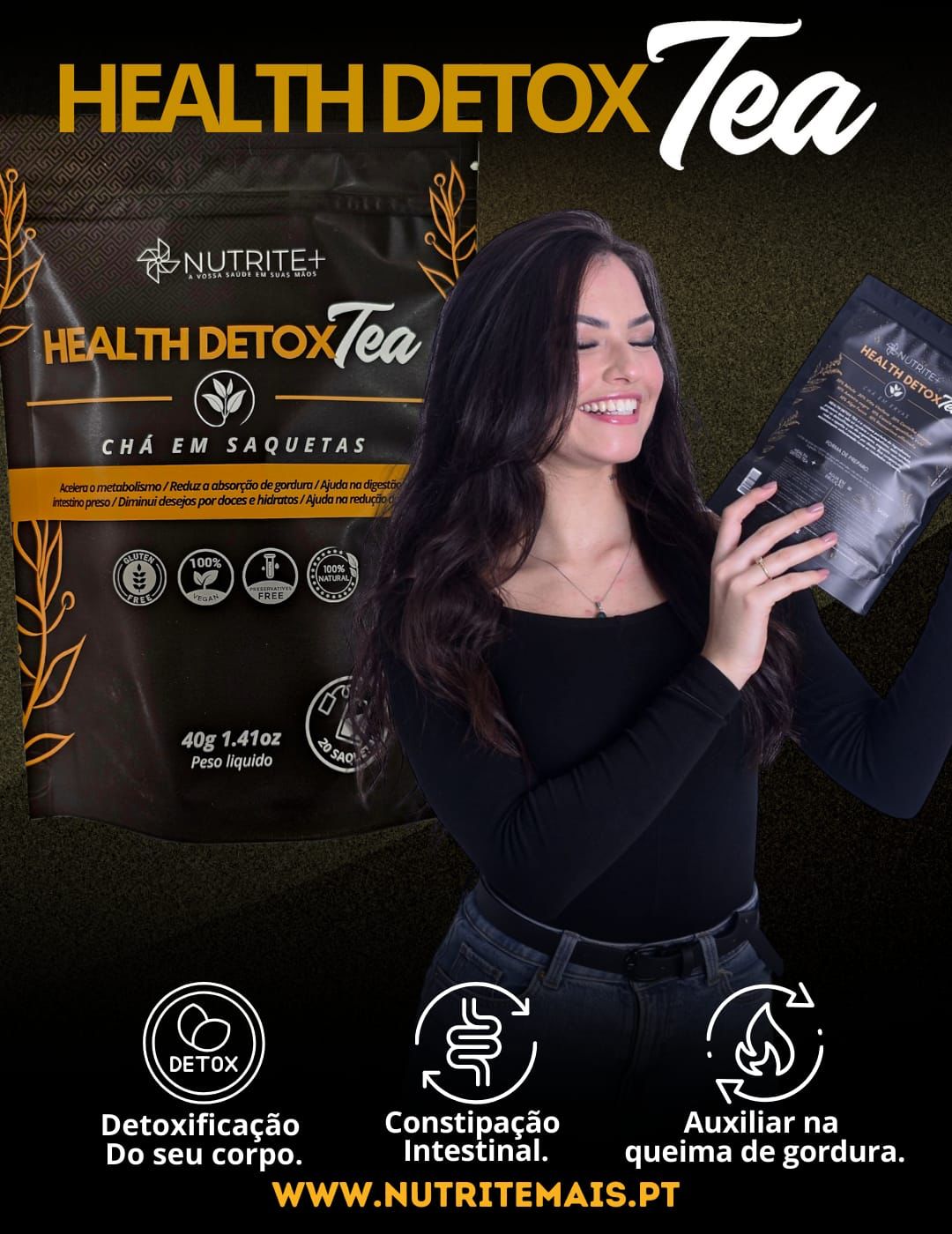 Pacote preto de Health Detox Tea da Nutrite+ com mulher a segurá-lo e texto promocional no fundo