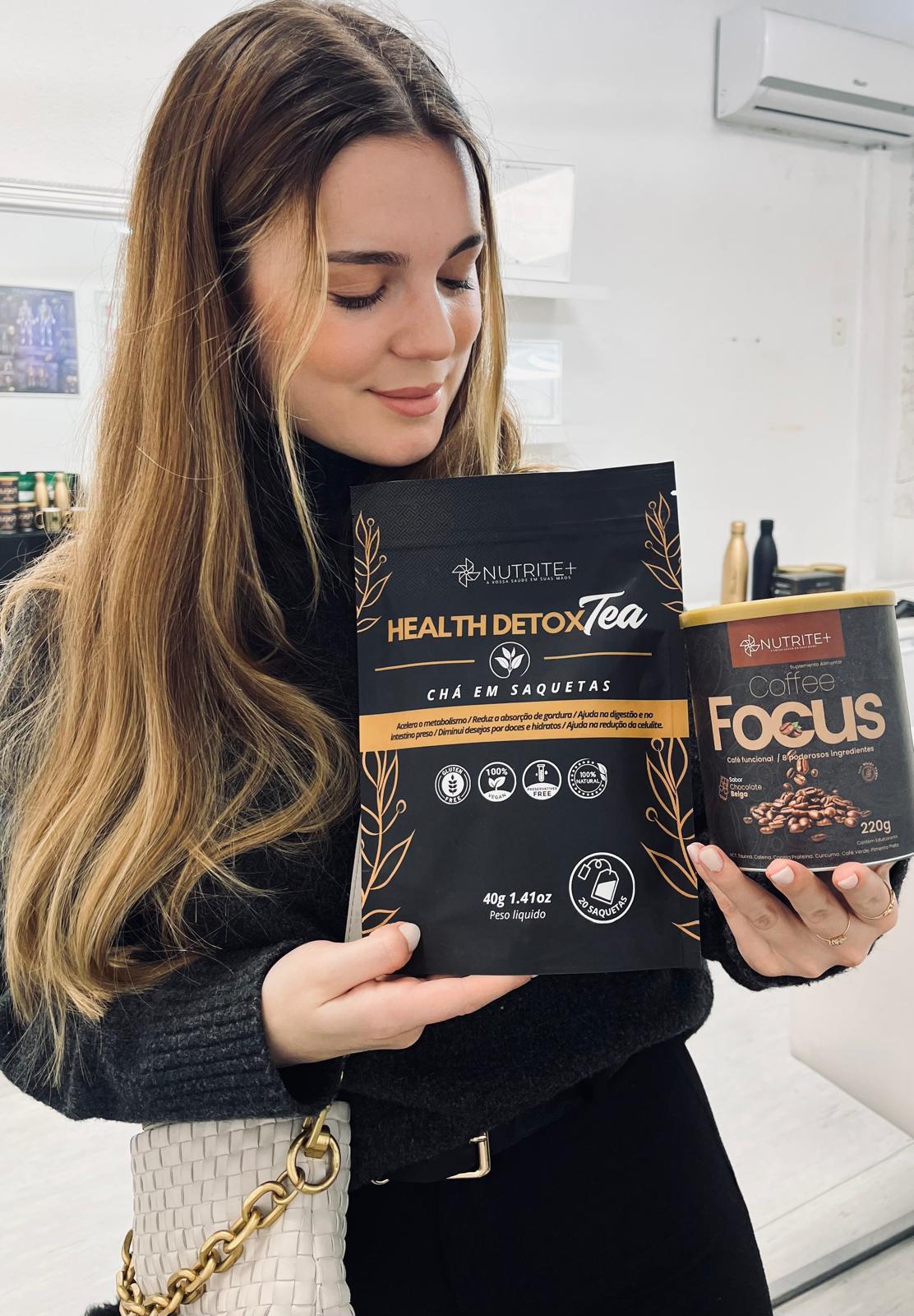 Mulher segurando chá Health Detox Tea e café Coffee Focus com embalagem preta e dourada