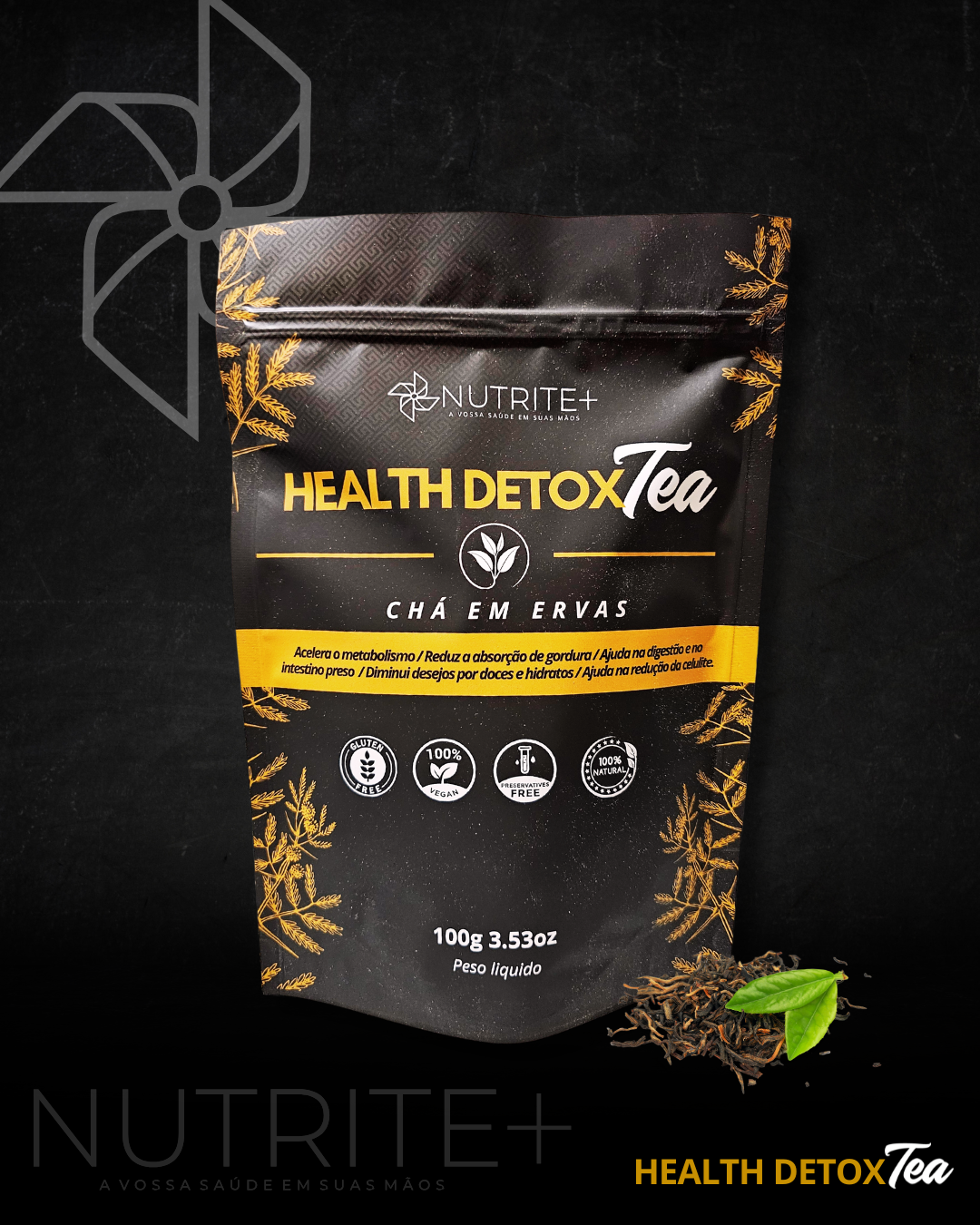 Embalagem preta de chá Health Detox Tea com detalhes dourados e folhas de chá secas ao lado